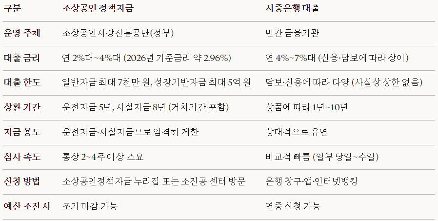 두가지를 혼동하거나 정책자금의 존재 자체를 모른 채 시중은행 대출만 받는 경우가 적지 않아요. 이 글에서는 두 제도의 구조적 차이를 명확히 정리했어요.